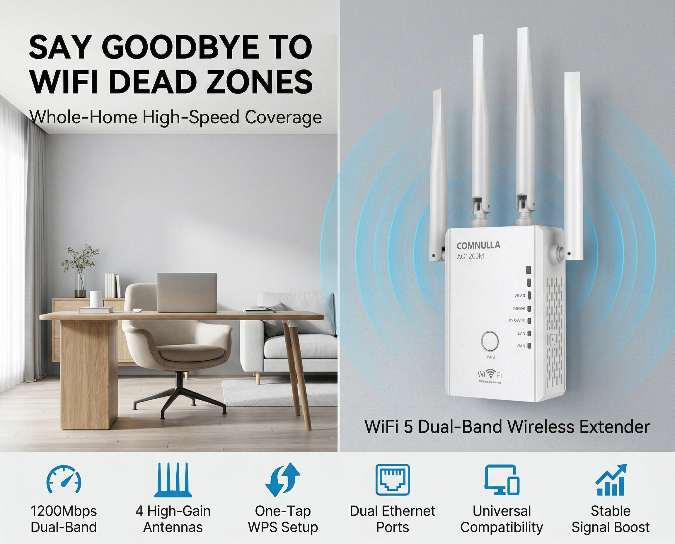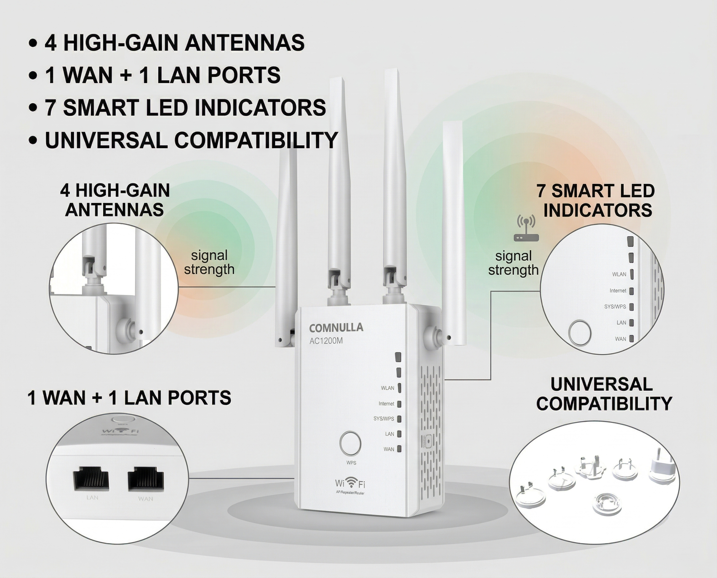 WiFi5 Extender ZY-MA813 MT7628DAN + MT7613BEN 1200Mbps 2.4GHz + 5.8G dual band 2*2 MIMO WiFi Extender 802.11b/g/n/ac WiFi standard, support WPA2-PSK 4*2dbi antennas 1*WAN + 1* LAN 10/100M RJ45 Port 3 working mode: extender, router, access point Back to Products